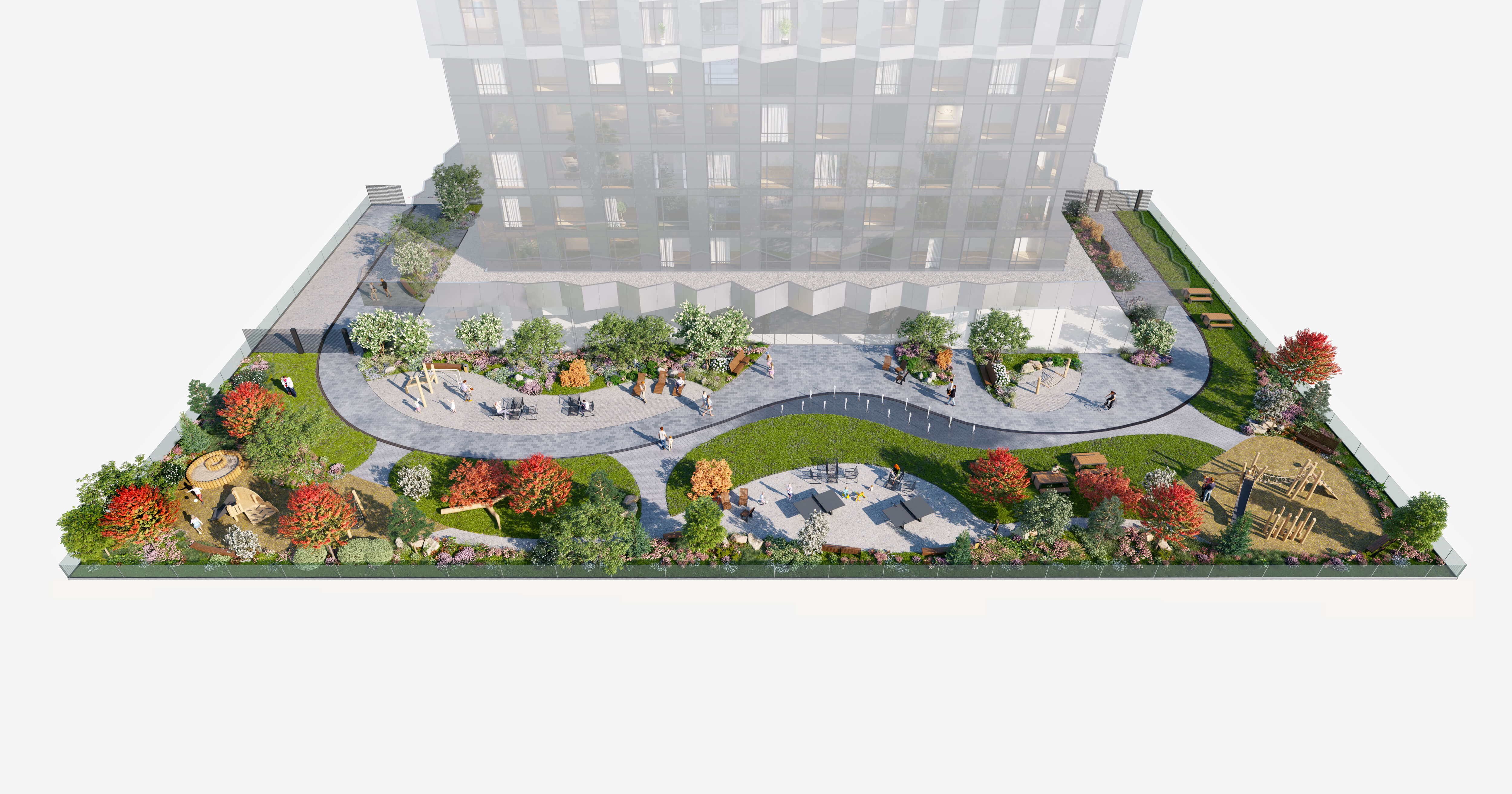 Для жителей квартала предусмотрено образовательное пространство: детский сад на 175 мест и школа на 350 учащихся, выполненные в стиле биофильного дизайна, подчеркивающего природную гармонию пространства.